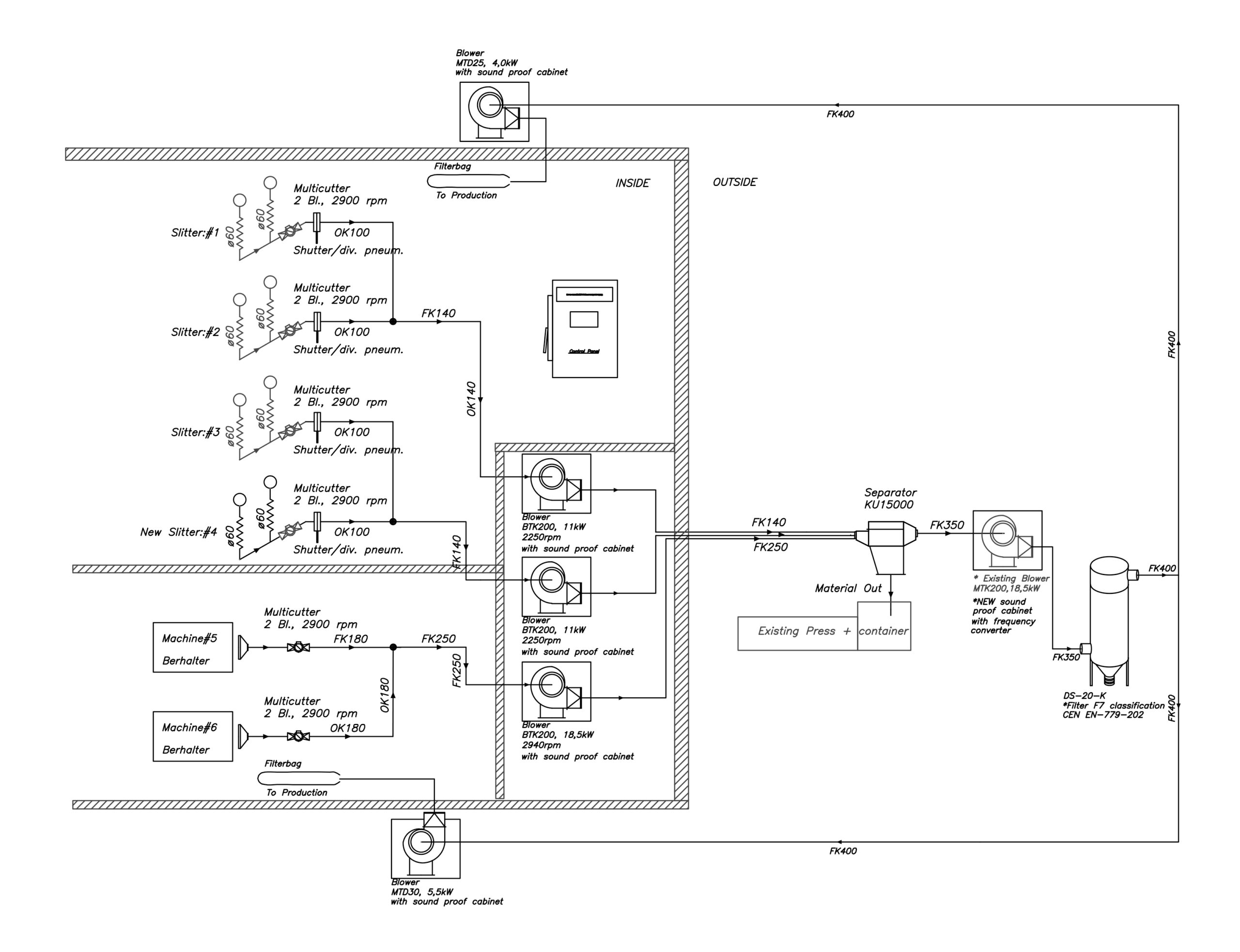 The system includes a series of MultiCutters connected to production machines, with BTK blowers providing the pneumatic power to transport material through OK and FK piping. A DS filter handles air purification, while MTD blowers return clean air to the production hall.